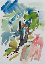 La série « garrigues » conserve la fluidité des encres de la série « arbres ». On y retrouve quelques aquarelles de petit format, des recherches, guides intermédiaires du passage de la figuration vers l’abstraction. Le cœur de la série est quant à lui composé de grandes toiles peintes à l’acrylique, plus précisément à l’encre acrylique et acrylique fluide. Ainsi le geste des encres sur papier est conservé. C’est une série à la fois puissante et toute en fluidité.